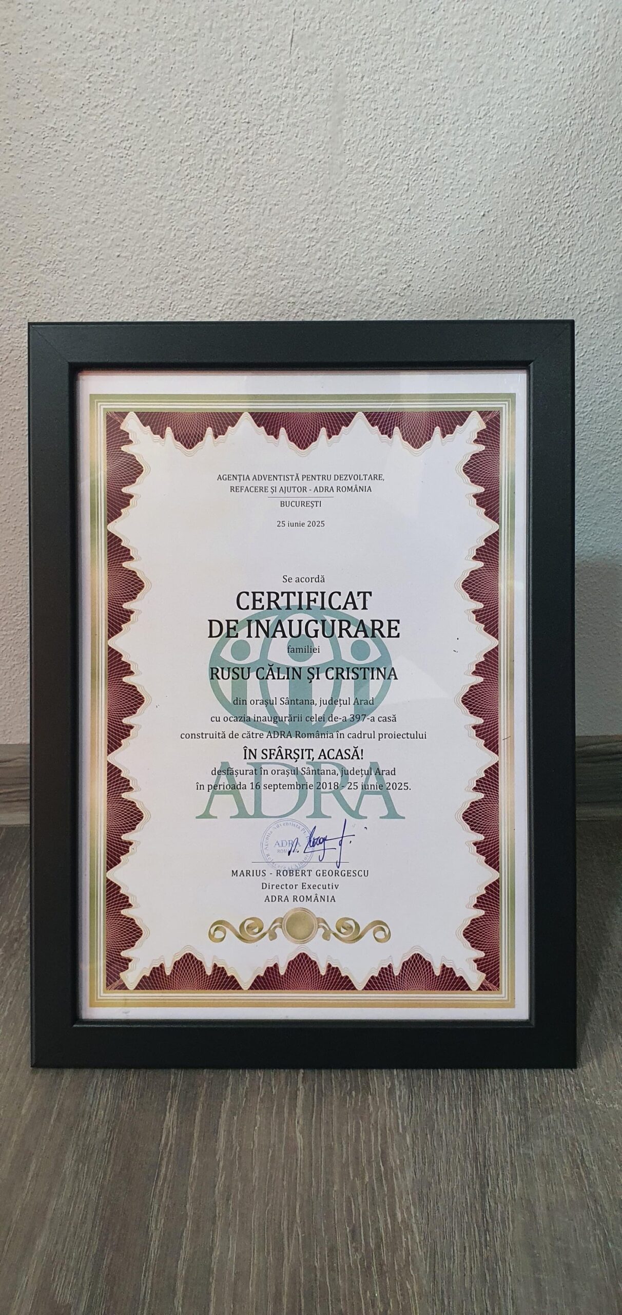 Miercuri, 25 iunie 2025, Agenția Adventistă pentru Dezvoltare, Refacere și Ajutor – ADRA România a inaugurat în orașul Sântana, județul Arad, a 397-a casă socială construită în cadrul proiectului ADRA "În sfârșit, acasă!" dedicată familiei Călin și Cristina Rusu și cei 5 copii ai lor, David, Anda, Denisa, Elena și Sofia.